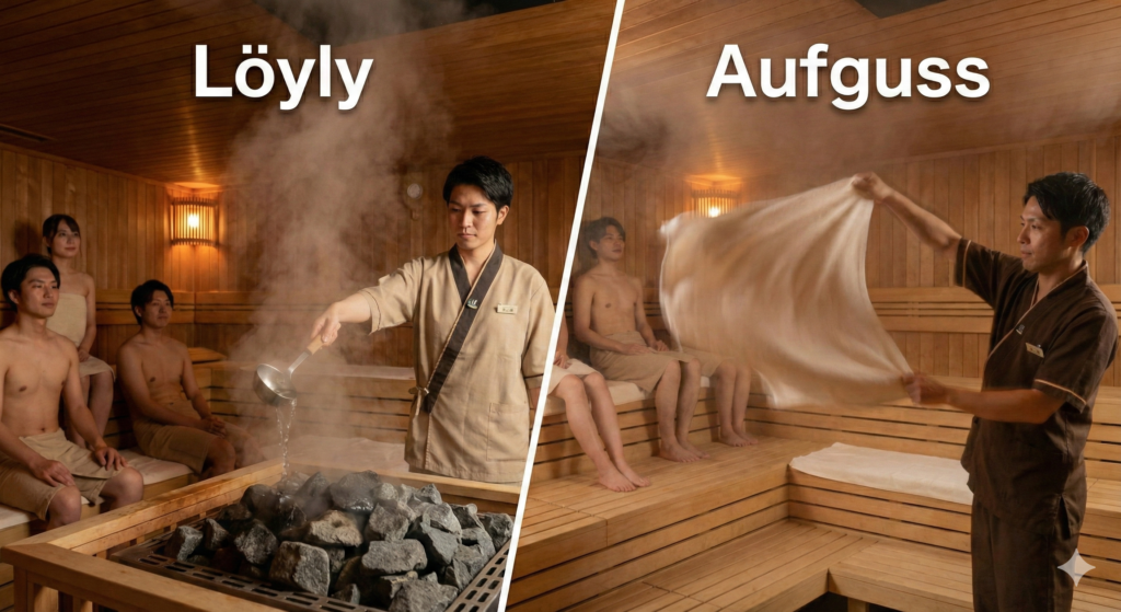 - Aufguss: a performance-style heat session where staff circulate hot air using towels or fans.